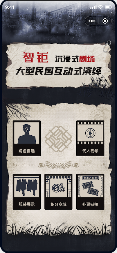页面分为6个条形框,自上而下依次为:1.logo图+名称,2.角色自选,3.代入视频,4.服装展示,6.补票链接,5.积分商城。