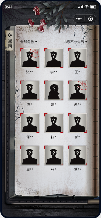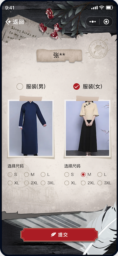角色自选:角色①、角色②……,点每个角色进入“服装展示”页面;在进入“角色自选”页面时做权限限制,需要输入密码,密码为后台每天自动更新生成,只有管理员能看到。