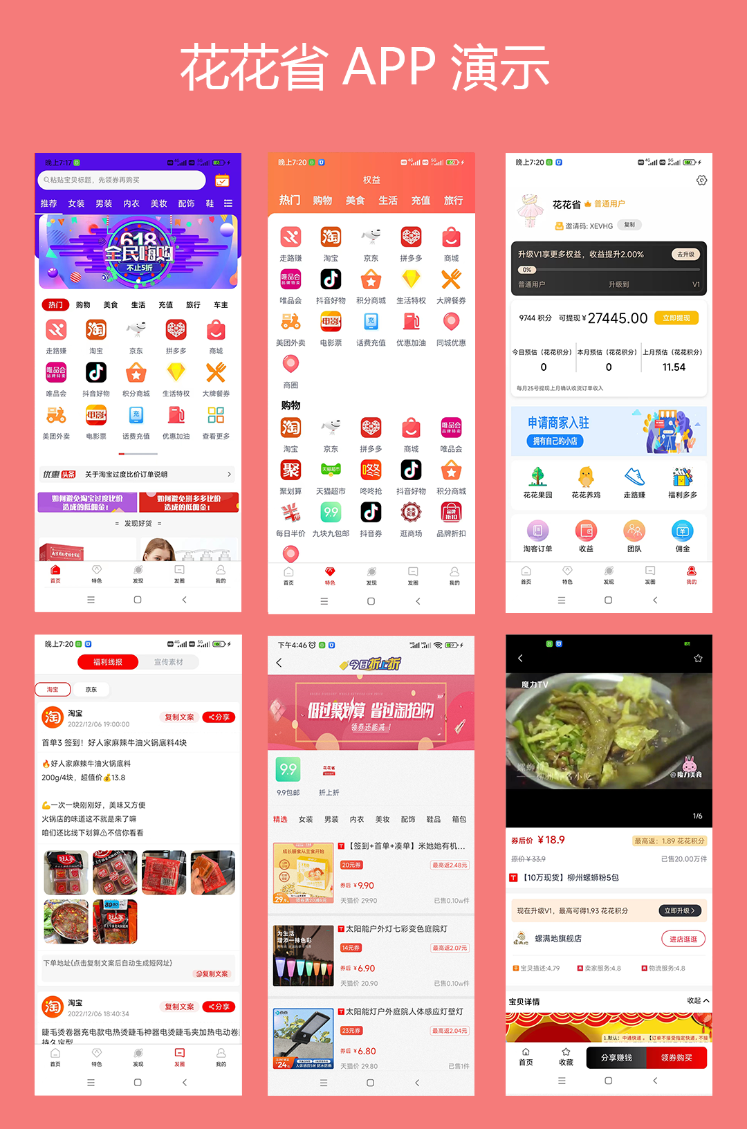 首页广告位、淘口令识别、微信登录、淘宝登录、淘宝返佣、拼多多返佣、京东返佣、唯品会返佣、热销榜、聚划算、天猫超市、9.9包邮、品牌特卖、新人攻略 、小米有品、优惠加油、阿里巴巴、去哪网、电影票、飞猪旅行、美团酒店、当当网、肯德基、热门抖货、商品推荐、商品详情、商品海报、APP检测升级、配置动态化、分享海报、会员授权、获取剪切板、精选商品、签到、积分兑换、淘口令解析、热门搜索、搜索历史、抖音直播、抖音电商、走路赚(选配),主页面主流布局,特色功能板块,团队代理,区域代理