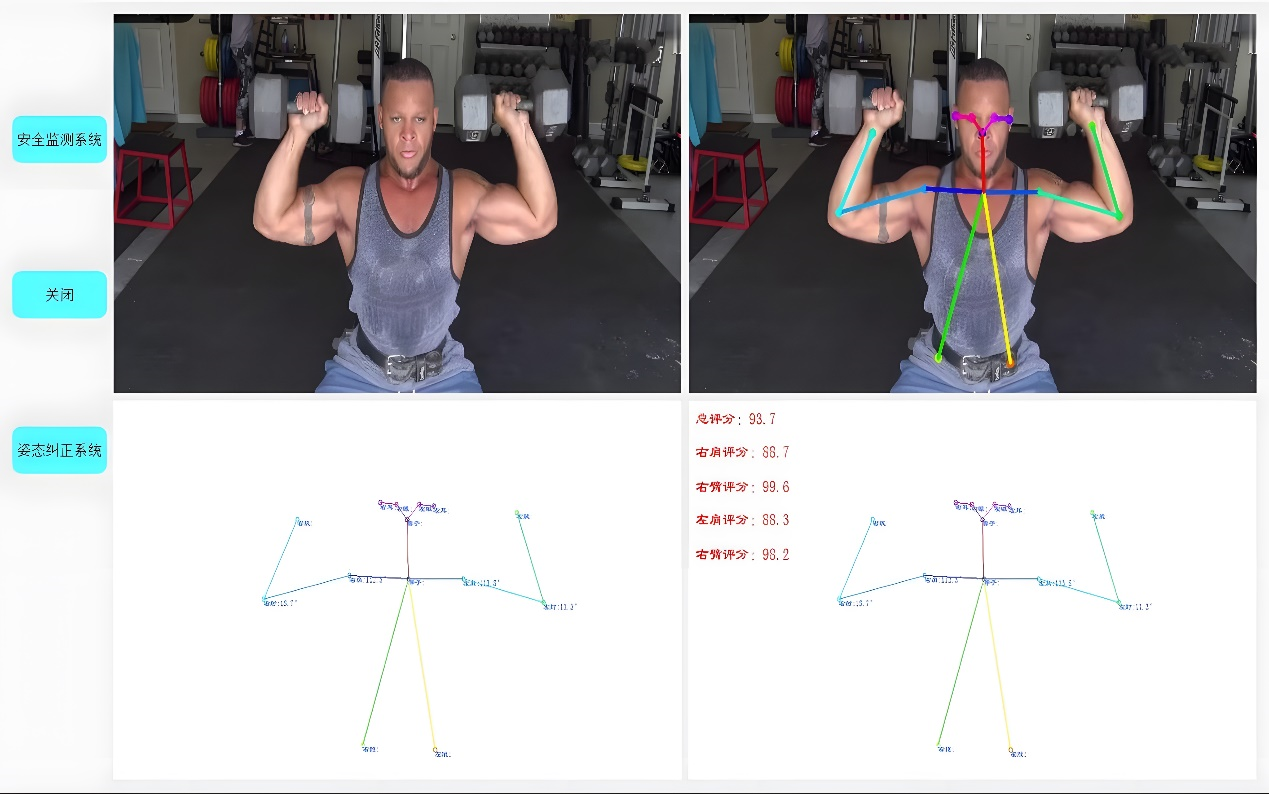 使用姿态估计技术,提取人体关键点后,对不同人体肢节进行组合,实时评估骨骼向量角数据,并根据人体向量角数据与建立好的标准动作比对,给出各肢体评分,和总评分。在这里我们以举哑铃动作为例,搭建我们的智能健身评分系统。