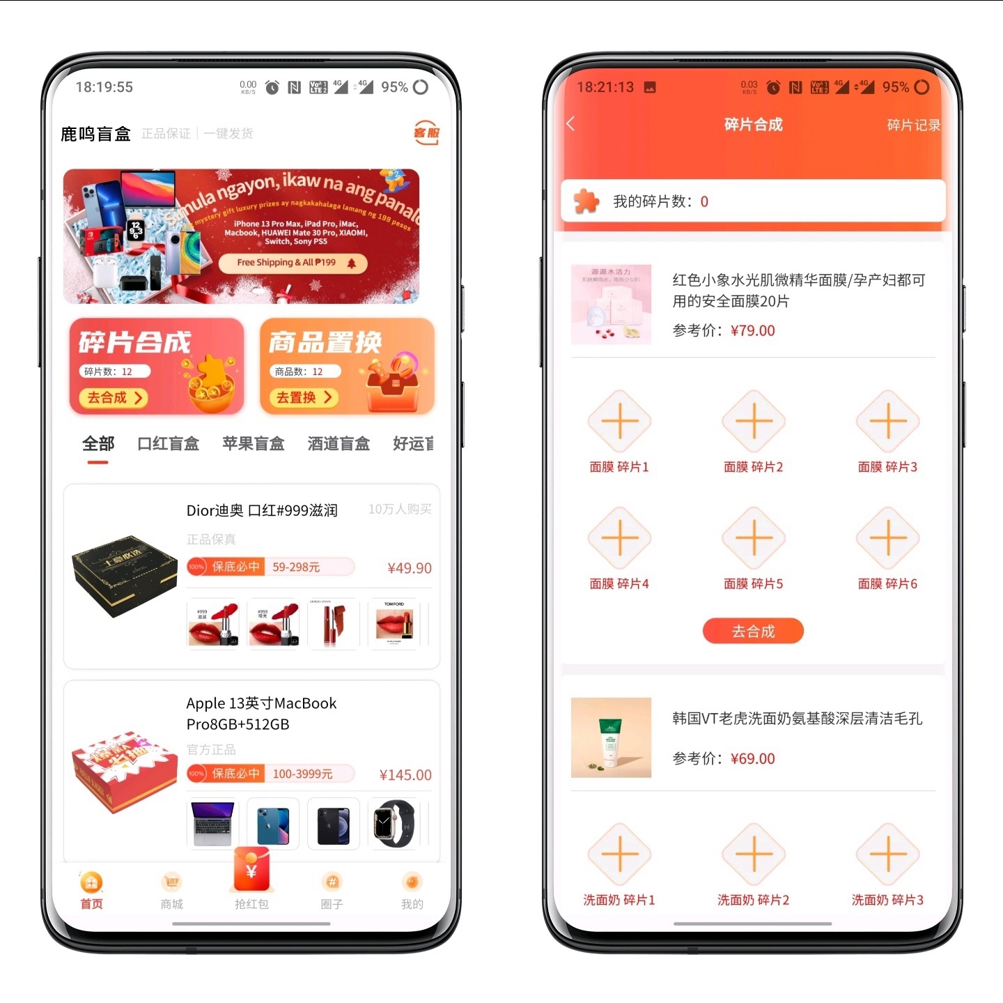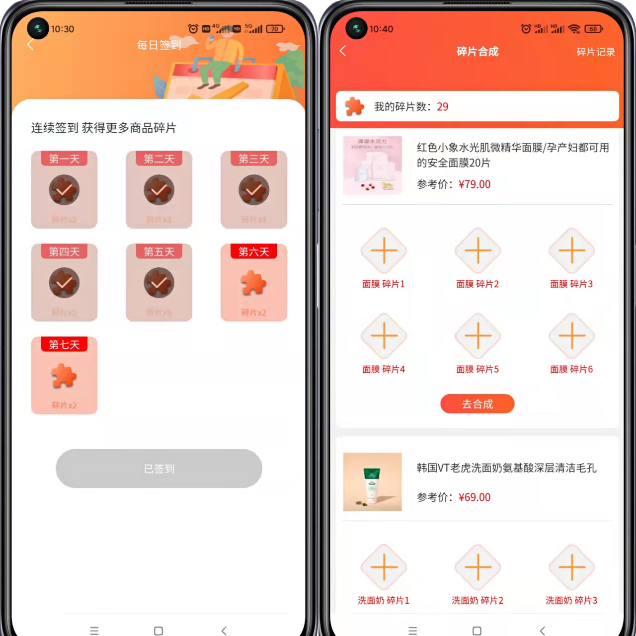 碎片合成/(抽盒和签到会随机给碎片,碎片有分类,只有该分类下的碎片够数量才能合成商品)