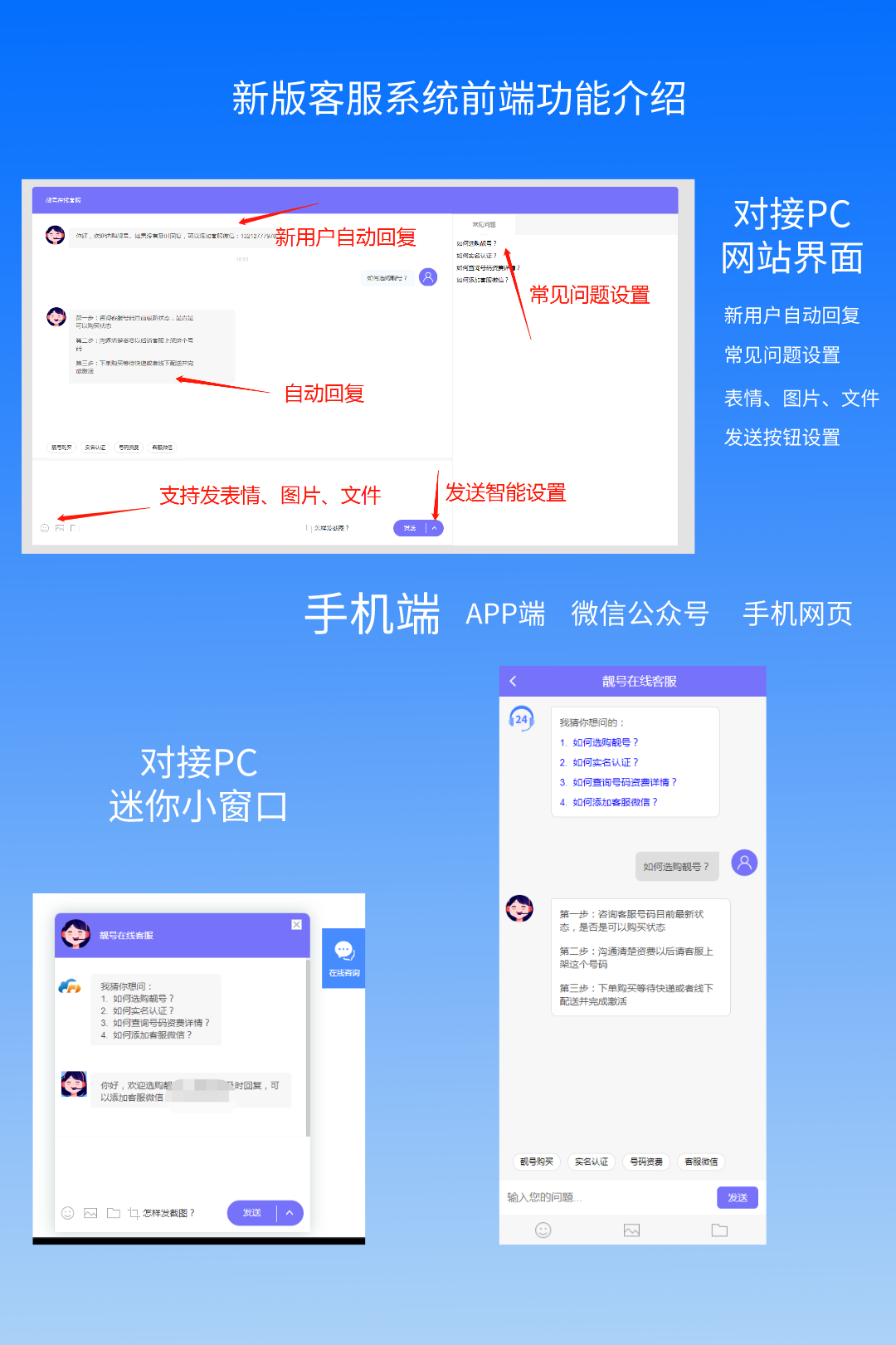 客服可提前设置好回复内容,点击标签即可快捷回复,节省时间微信表情微信emoji表情全套支持发送图片、txt、zip、pdf、xls、doc…