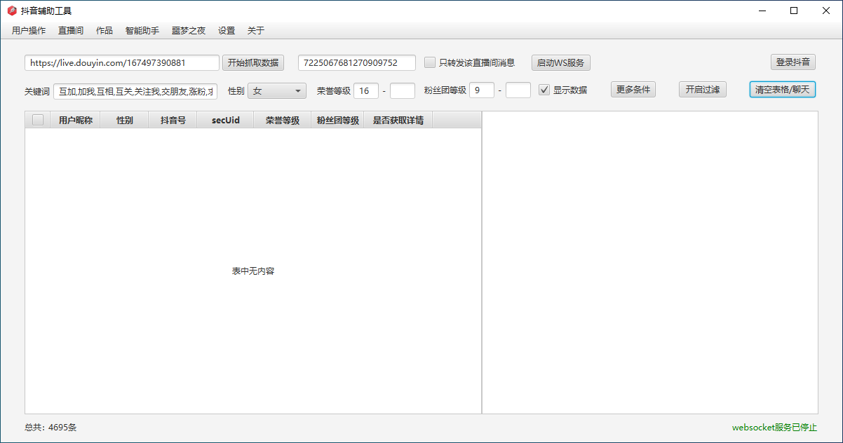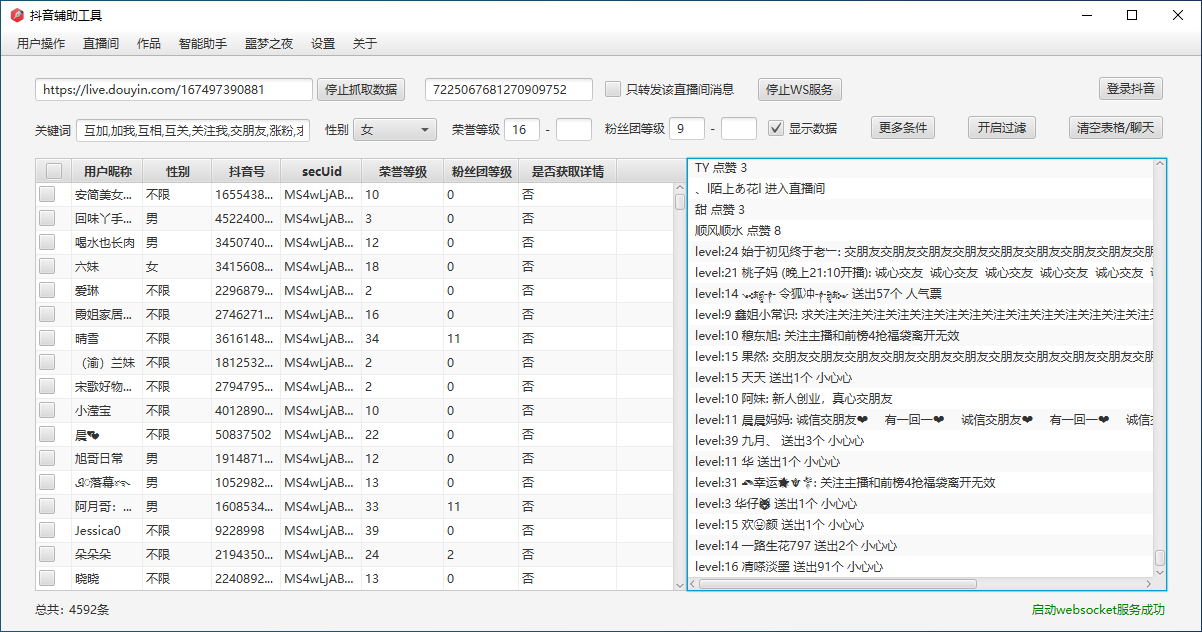 /** * 礼物ID */ private Long giftId; /** * 礼物名称 */ private String giftName; /** * 抖币值 */ private Integer price = -1; /** * 重复数量 */ private Integer repeatCount; /** * 连击数量 */ private Integer comboCount; 具体的礼物ID可以参考类:GiftMappingConfig Tips:第一次需要下载Chrome.zip,然后解压到C:\douyin目录下,最终目录为:C:\douyin\Chrome Chrome.zip下载地址:下载