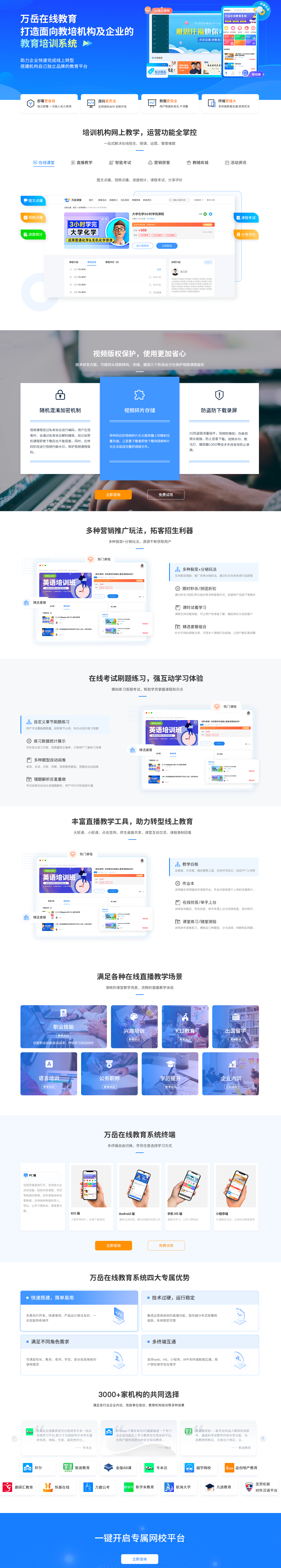 万岳科技,为教培机构提供一站式在线教学平台/网校系统,支持万人直播、营销引流、直播录播教学、题库考试等功能,助力您全渠道招生获客,实现知识变现。