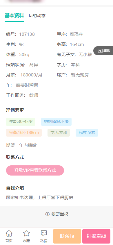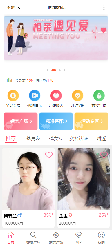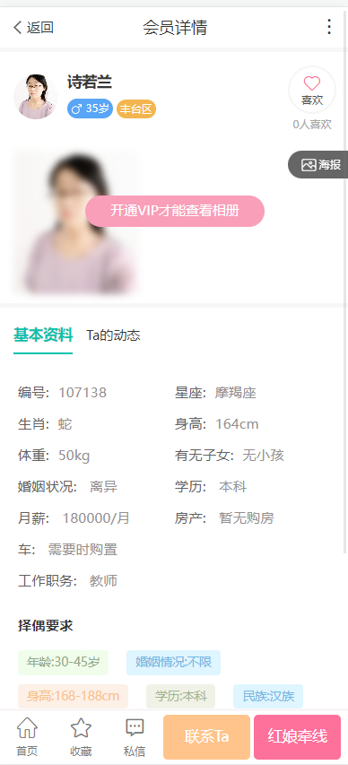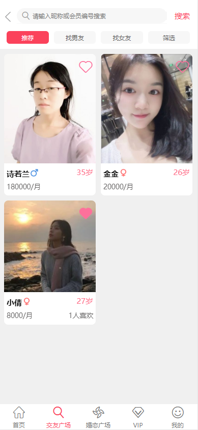 2、支持会员匹配推荐,根据用户填写的择偶需求推荐;